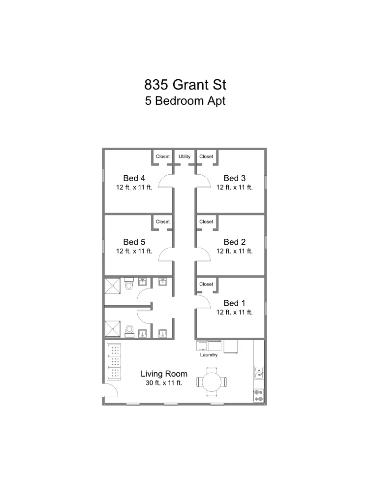 835 Grant Street is one of the best off campus housing locations in town! With 2-5 bedroom condos, this is the place for you, no matter your group size. Tired of long walks to class? Tired of riding the bus; then this is the place for you. Roll out of bed and be in class before you even wake up. Remodeled last year, this apartment is ready and waiting for you. Beautiful kitchen, washer/dryer in the unit, flat screen on the wall, and nice sized bedrooms. Parking is available on site. All utilities are included. These won’t last long, so call today!!